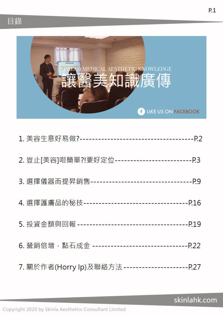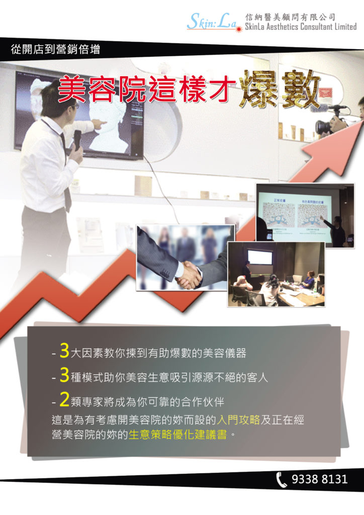 美容創業心得| 美容院內不同身份發展與成功的貼士 成功非僥倖,生意成功更是策略與努力的表現。美容創業需要各項資訊。作為供應商,我們能為您總結不同美容創業心得,分析開美容院準備需要的儀器及合作夥伴、計算開美容院成本,無論自己開美容工作室、家庭式美容院、剛學做美容、開店創業還是在業務上的任何階段,我們都可為您的業務提供專業的建議,我們不定期會更新不同的心得,在美容創業路上提供合適建議。 推薦給美容院老闆們: 『美容營商系列📈』 ✨美容院搵新客戶👩👩👧👧必看👀👀✨ 美容業近十年來嘅變化已經變成現在極高競爭嘅紅海,單憑舊式宣傳策略包括廣告甚至電台節目等到今日已經難以有效尋找新 … 推薦給美容師們: ✨美容師及顧問👩🏫必看👀搵出高“🤑錢🤑”途✨ 美容是充滿機會嘅行業,即使屋邨美容院幾位美容師都可能每人收入近十萬,的確是不錯的出路。 想在此行業搵到更高人工 … "美容院這樣才爆數" - 100%免費美容創業電子書 想做美容生意更容易發展? 參考其他美容院經驗絕對是必要。我們集合了不同模式的美容生意成功之道,由開業策略、儀器護膚品的選擇,開業成本等令用專業的市場策略一一為你分析,再配以實質成功例子,助你發現致勝之道。– 3大因素教你揀到有助爆數的美容儀器 – 3種模式助你美容生意吸引源源不絕的客人 – 2類專家將成為你有效的合作伙伴 如欲免費索取此電子秘笈,可留下Email我們將盡快Email/Whatsapp給你。如想快人一步獲得獨到的美容生意見解及資可留Whatsapp電話 Please enable JavaScript in your browser to complete this form.Name *Email *想更緊貼最新醫美資訊及生意貼士,可留下WhatsappSubmit 美容生意貼士Blog: 與埋線毫無關係的”無針埋線”📌📌📌 • 醫美字典 這2年最熱門的儀器可說是無針埋線了。其實所謂的” 無針埋線”的確是醫美界點石成金的代表作,其技術已經是多年前已 … 與埋線毫無關係的”無針埋線”📌📌📌 Read More » 膠原槍與眼袋槍🔫🔫🔫 • 醫美字典 自從無針埋線大熱之後,把舊有技術改一個新名再推出市場變成了點石成金的策略。膠原槍與眼袋槍就是其中的例子。 最初 … 膠原槍與眼袋槍🔫🔫🔫 Read More » 💥⭐️廣州🇨🇳及韓國🇰🇷醫美儀器展⭐️💥 第一篇 – 《《放棄一個地方嘅儀器可能等於放棄一個潮流》》🇰🇷🇨🇳🇭🇺🇬🇧🇺🇸💸💸💸💸 • 美容展覽 廣州美博會今年嘅變化真係好大,因為內地最近大力打假,幾乎全部高仿機都絕跡,同上年高仿機係主角嘅情況完全相反。 … 💥⭐️廣州🇨🇳及韓國🇰🇷醫美儀器展⭐️💥 第一篇 – 《《放棄一個地方嘅儀器可能等於放棄一個潮流》》🇰🇷🇨🇳🇭🇺🇬🇧🇺🇸💸💸💸💸 Read More » 💥⭐️廣州🇨🇳及韓國🇰🇷醫美儀器展⭐️💥第二篇 – <<<買醫美儀器低至半價😍的策略,免除中間商賺差價>>>🤑🤑🤑💵💵💵 • 美容展覽 愈來愈多醫美診所及美容院同事都參加廣州及韓國展,直接從生產商入貨免除了中間商賺差價。如果客人真係準備添置儀器, … 💥⭐️廣州🇨🇳及韓國🇰🇷醫美儀器展⭐️💥第二篇 – <<>>🤑🤑🤑💵💵💵 Read More »