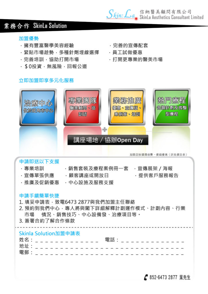 醫美項目合作可以助你$0成本引入醫美專業業務。由醫美微整材料採購、醫美知識培訓、宣傳方法及定價策略,均一一為你準備好,讓您的美容事業更上一層樓。