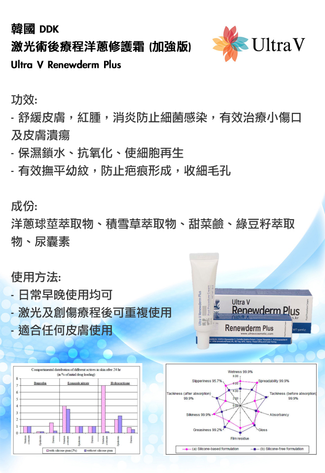 Ultra V 生產商知名度甚高,可以媲美歐美最受歡迎的醫美生產商,其推出的Ultra V Renewderm Plus洋蔥膏,即是韓國大熱洋蔥Cream。又稱為UltraV再生修復膏,使用在INCI註冊的安全材料,功效顯著,有效令肌膚快速更生,撫平肌膚,同時具保濕及鎮靜舒緩之作用,形成天然人工皮膚保護膜,平衡調節肌膚所需養分。